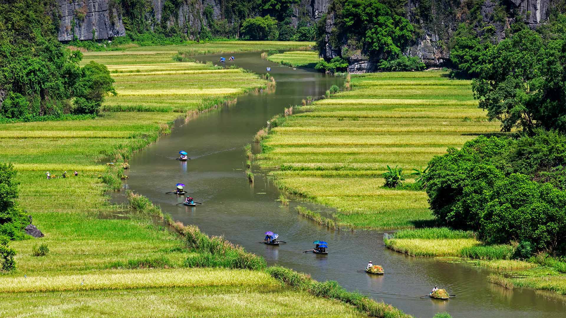 Boats float by rice fields on the Ngo Dong River in Ninh Bình province, Vietnam (© Jeremy Woodhouse/盖蒂图片社)