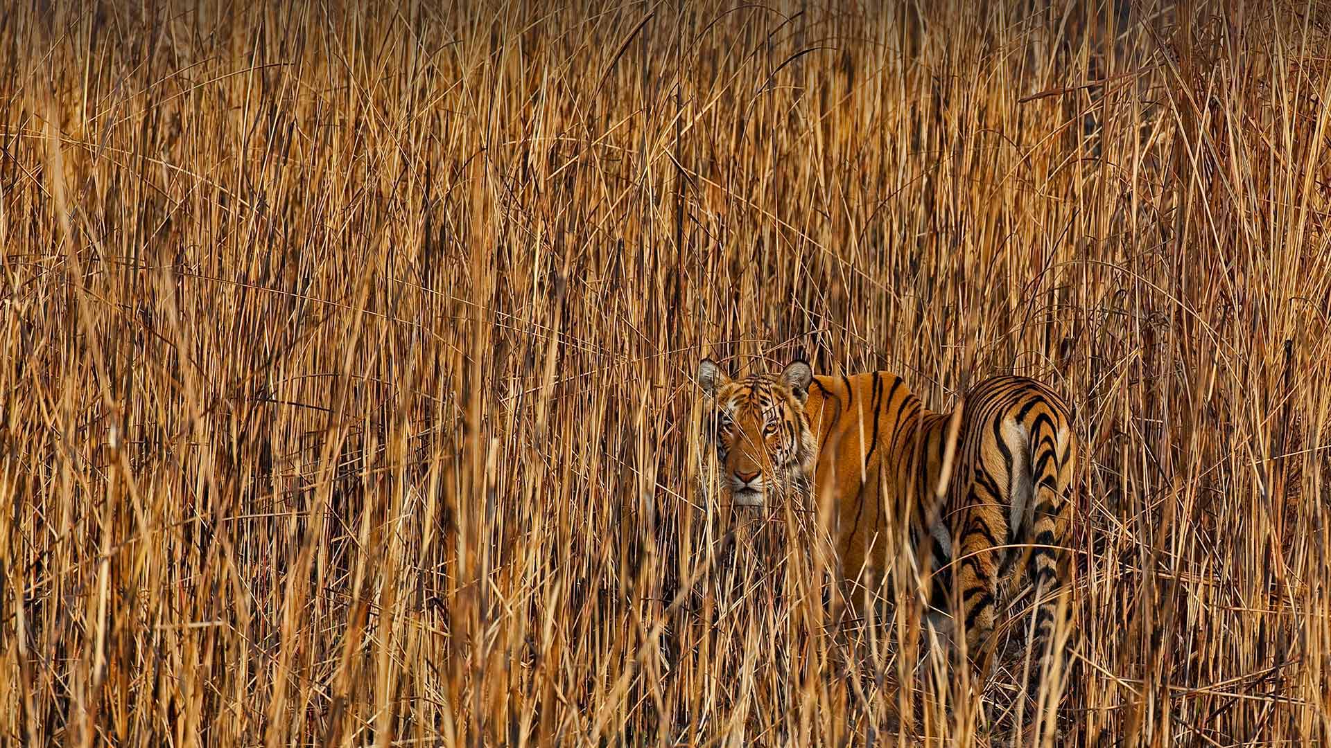 Tiger camouflaged in tall grass, Assam, 印度 (© Sandesh Kadur/Minden Pictures)